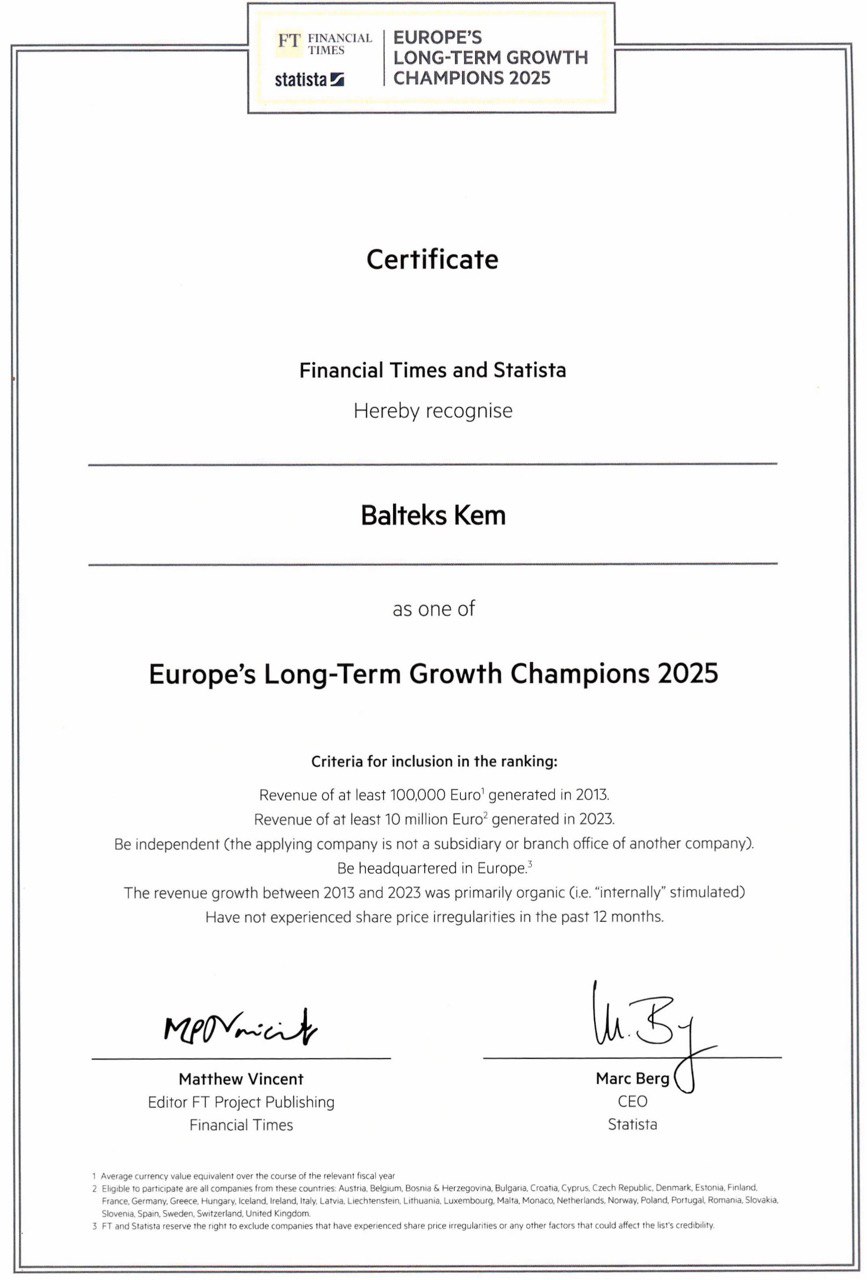 In 2024, Financial Times and Statista recognised Balteks Kem OŰ as one of Europe's Long-Term Growth Champions 2025.